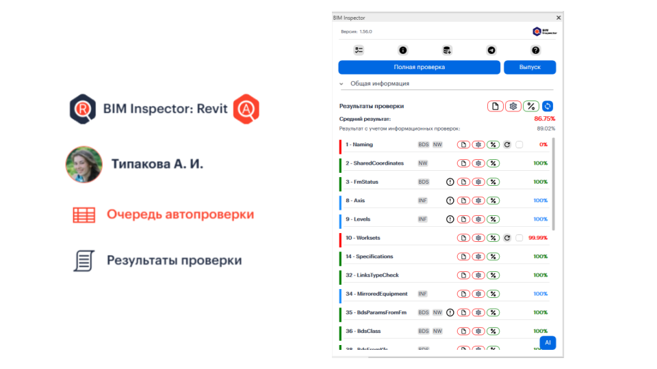Следующий продукт, с которым сталкивается проектировщик, — это BIM Inspector, система проверки моделей на соответствие BIM требованиям. Проектировщики чаще всего используют десктопную версию приложения: в ней удобно отслеживать, как изменения модели влияют на соответствие требованиям. Реже используют веб-версию — в основном, чтобы отследить очередь на автоматическую проверку и ее результаты.