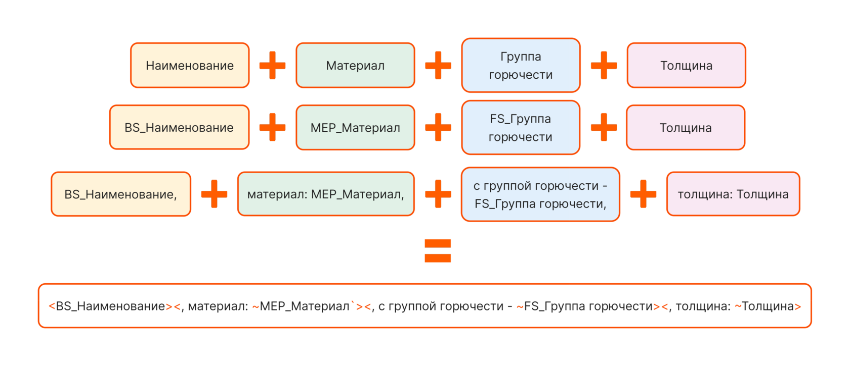 Простая конструкция в виде перечня параметров, из которых инструмент получает значения, дополняется знаками препинания, пробелами и вводными словами, далее добавляем символы, которые склейка считывает как действие, которое ей нужно выполнить. Это и есть формула, т.е. то что запишется в качестве результата работы инструмента.