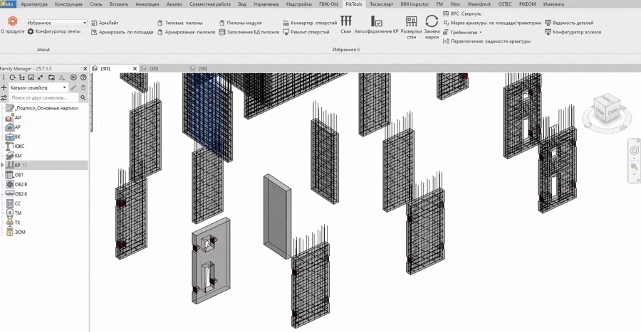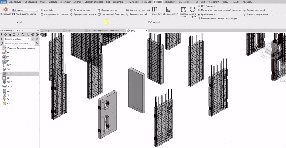 - размещает армирование в конструкцию. Армирование выполнено в виде системных семейств