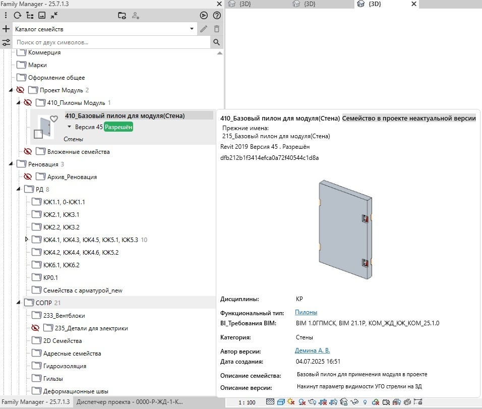 База с настройками модульных пилонов хранится в специализированной базе данных, доступ к которой осуществляется через Swagger. Загружаемое ifc семейство «болванки» модульного пилона хранится в библиотеке Family Manager.