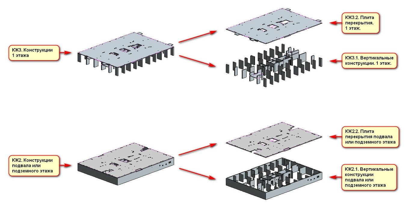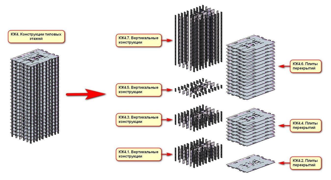 Исключение составляют типовые этажи — для них применяется укрупнённое деление (несколько этажей в одной модели).