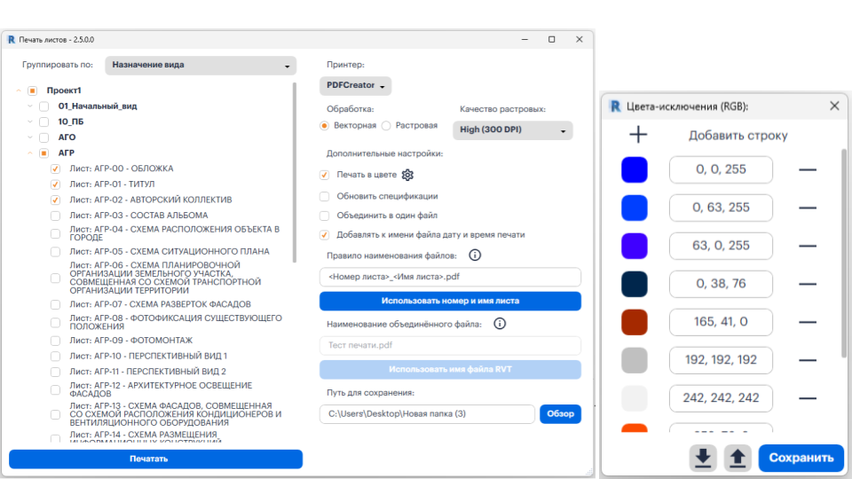 Одними из ключевых возможностей являются печать листов из связанных файлов, а также возможность задать цвета-исключения при выборе печати не в цвете. Например, цвета подписей, цвета, используемые в логотипе компании, если не хочется печатать весь лист в цвете. Список цветов можно настраивать в плагине и затем экспортировать, либо наоборот импортировать настройки.