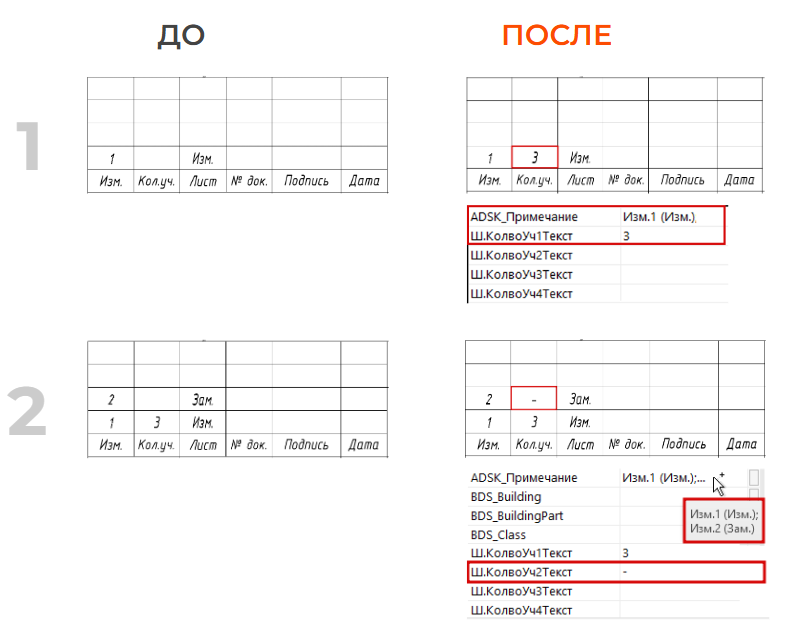 При предварительном заполнении графы "Лист" в штампе плагин выполняет всю необходимую работу - на основе расставленных пометочных облаков для каждого листа подсчитывает изменения и заполняет в нужном виде в соответствии с ГОСТ параметр, который является графой "Примечание" в ведомости.