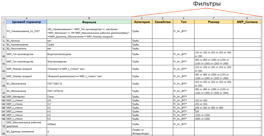 В таблице Excel мы указываем параметр (Целевой параметр), в который должно записаться значение, само значение (Формула) и в какие элементы (на рисунке ниже обозначено как Фильтры). Например, в элементы категории "Трубы", у которых имя типа начинается на "PI_Ун._ВГП".