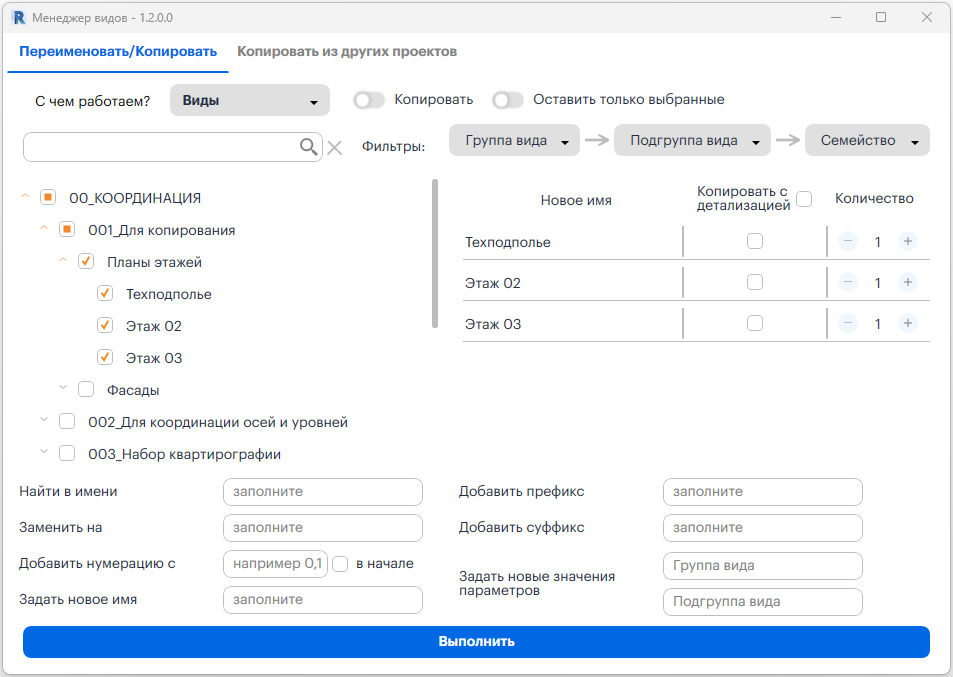 Стандартный функционал Revit не позволяет создать необходимое количество копий видов за один клик, а также пакетно изменять наименование видов. Менеджер видов содержит в себе 3 блока: копирование видов, легенд, спецификаций; их переименование , а также копирование из других проектов чертежных видов, легенд, спецификаций и шаблонов видов.