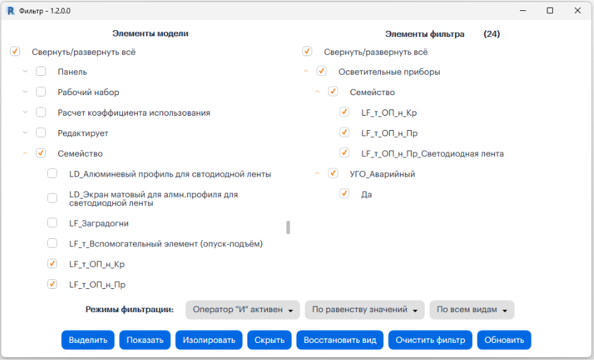 Например, на скрине ниже будут найдены все семейства категории "Осветительные приборы", у которых имя семейства равно "LF_т_ОП_н_Кр" или "LF_т_ОП_н_Пр" или "LF_т_ОП_н_Пр_Светодиодная лента" и в параметре "УГО_Аварийный" включена галочка. Помимо этого настройки режима фильтрации позволяют искать элементы как по всем видам, так и только среди тех, что есть на активном виде. Также при помощи плагина можно скрыть, изолировать, выделить, показать отфильтрованные элементы.