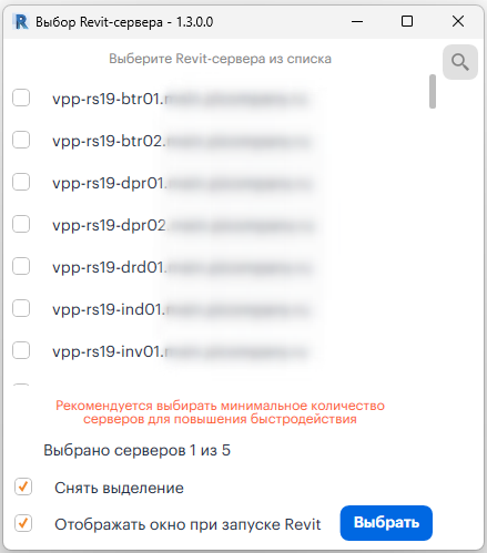 Данный плагин актуален при большом количестве Revit-серверов в компании. Например, у нас работает около 2,5 тысяч проектировщиков, на серверах хранится около 60000 моделей и на данный момент используется 57 серверов. При помощи этого инструмента проектировщики и BIM-координаторы могут легко выбрать нужные сервера для работы.